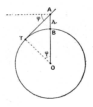 A φ szöget a látóhatár sülyedésének nevezzük. Ha a h magasság, a melyre a kísérlet czéljából fölemelkedtünk, 100 m., akkor a szög értéke 19 percz 16 másodpercz.