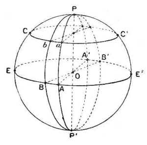 b) Szélesség. A Földön fölvett b ponton fektessünk síkot a sarkok vonalára merőlegesen: ez a sík a gömböt a CbaC' kisebb körben metszi; ez a kör párhuzamos kör, a b pont párhuzamos köre.