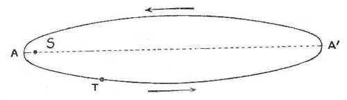 106 000 kilométernek adódik ki.De tudjuk KEPLER második törvényéből, hogy a Föld sebessége a pályáján nem egyenletes: nagyobb a perihéliumban, A-ban es kisebb az aféliumban A'-ben. Midőn a Föld a legkisebb sebességgel halad előre, még akkor is