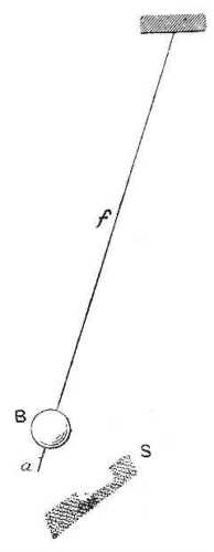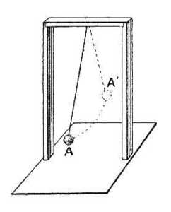 Vegyünk egy kis, fakeretre függesztett ingát (7. rajz); lendítsük ki valamely meghatározott irányban. A míg az inga leng, forgassuk lassan a keretet függőleges középvonala körül; az inga lengéssíkja nem fog elmozdulni és ha folytatjuk a támaszték elfordítását, a keret, a mely eleinte merőleges volt az inga lengéssíkjára, végre e síkba esik a nélkül, hogy az inga egy pillanatra is eltérne eredeti irányától.