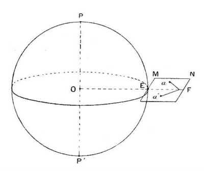 Vigyük át most a kísérletei az egyenlítőre: az E ponton állítható függőleges (l. a 9. rajzot) OEF lesz, merőlegesen a tengelyre. Szemléltessük a lengés síkját MN négyszöggel. Az inga e síkban fog mozogni, a mely változatlan marad; de ez a sík az egyenlítő síkja; látjuk hát mindebből, hogy e sík merőleges lévén a forgástengelyre, valóban változatlan; a függőleges mindig a középpont felé irányulva ebben a síkban marad. Az inga ennek következtében semmiféle látszólagos kitérő mozgást nem végez és a tű mindig ugyanazt a barázdát húzza a homokban.