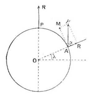 Ábrázolja a Földet az O középpontú kör (10. rajz). Legyen PR a tengelye körüli forgás. Valamely λ földrajzi szélességű A helyen a függőleges irány OA. Az inga tehát az OA körül leng. Húzzunk A-ban a PR-rel párhuzamos és vele egyenlő vonalat; bontsuk föl ezt a forgást két összetevőjére: az egyik AR', a helyen vonható függőleges irányába, a másik AM, a délkörhöz vonható érintő irányába esik. A látszólagos AR' forgást a hely függőlegese körűl következő kifejezés adja meg: