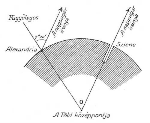 ERATOSZTÉNESZ azt észlelte, hogy a nyári napfordulókor dél-ben a felső Níluson fekvő (éppen azon a helyen fekszik ma Asszuán) Sziéne város kútjainak feneke nincs árnyékban; ebből azt következtette, hogy a Nap ezen a napon délben a város zenitjében van. Másrészt Alexandriában ugyanezen a napon egy hosszú egyenes rúd árnyékának megméréséből azt állapította meg, hogy a Nap 7° és 12'-re tér el a zenittől.
