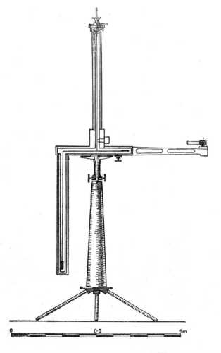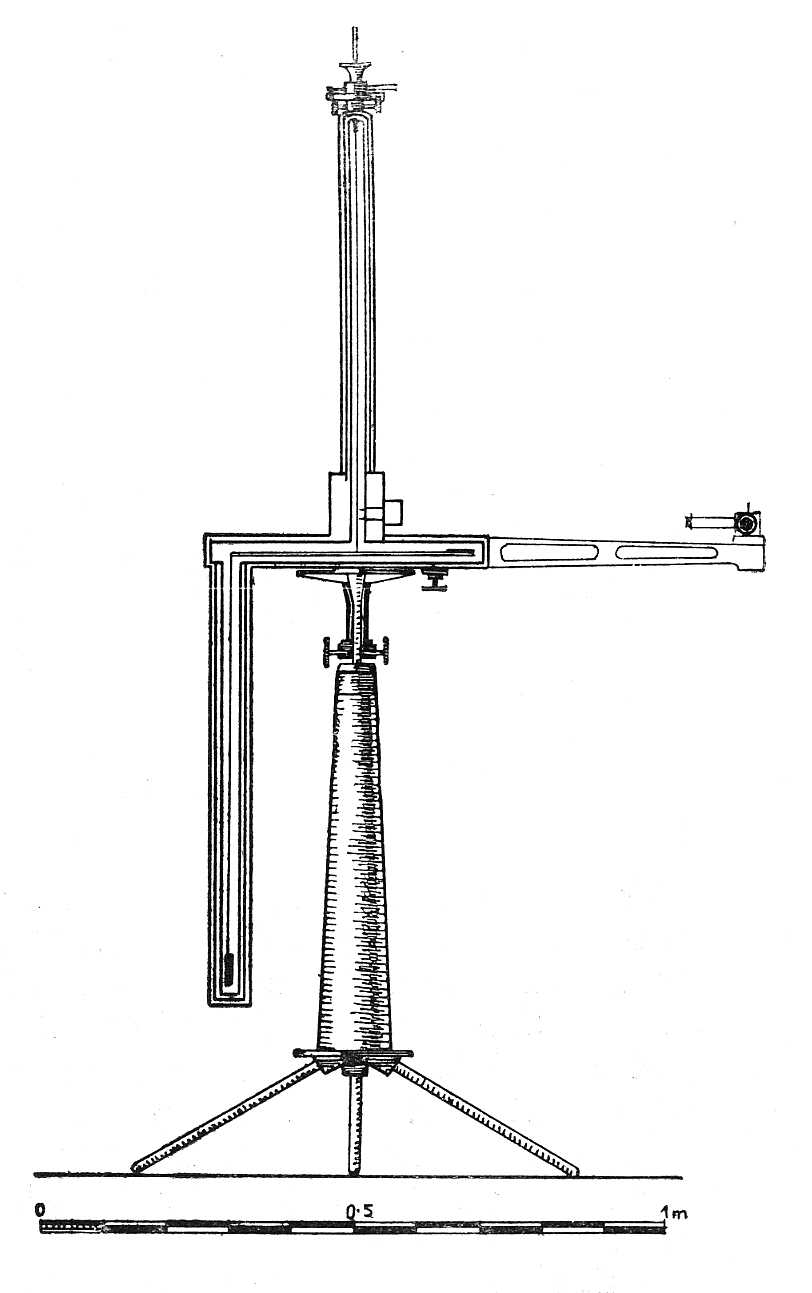 platinaszálon függ, melynek hossza körülbelül 60 cm. és átmérője 1/25 milliméter. Ezt a szálat több hónapig maximális súlylyal (mintegy 150 g.-mal) terhelték. A platinadrót- és mérlegkar-rendszer lapos, vastag, kétfalú rézszekrényben van fölfüggesztve, melynek falai a rúdhoz közel vannak elhelyezve, hogy a hőmérséklet lehetőleg egyenletesen kiegyenlítődjék. A felszálló áramlatok elkerülése czéljából annak a térnek a magassága, a hol a mérlegkar mozgását végzi, a lehetőségig kicsiny. A mérlegkar kilengésének tartama felette nagy s némely kísérletkor 860 másodperczig tartott. Az észleléseket tükörleolvasással végzik, mint a galvanométer esetében.