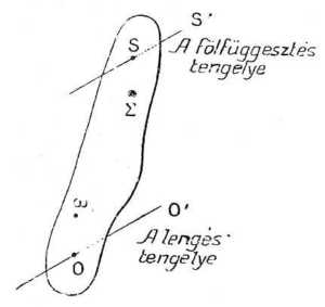 66 70. Összetett inga. A fölfüggesztés és a lengés tengelye. Az összetett inga bármilyen alakú, merev test lehet, mely egyik S pontja körül lengéseket végezhet (l. 27. rajzot). Nyugalmi állapotban ez a test olyan egyensúlyi helyzetet vesz föl, hogy fölfüggesztő S pontja és súlypontja a hely függőlegesébe esik. Ha a rendszert kimozdítjuk egyensúlyi helyzetéből, igyekszik visszatérni oda, a függőleges körül lengéseket végezve, melyek egyenlő időközűek, ha a legnagyobb kilengés igen kicsiny.