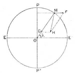 De van itt egy részben ellensúlyozó erő is, mely növeli (*) a nehézkedést az egyenlítőn; ez az a vonzás, a melyet az AEBε egyenlítői duzzadás tömege gyakorol az a pontra; ez a hatás okozza, hogy az egyenlítőn a nehézkedés csökkenése kevésbé erős, mint a középponttól való távolság szerint gondolnók.