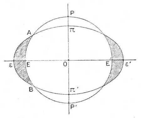 2. A lapultság hatása. A Föld délköre a helyett, hogy a PEP'E' körvonal szerint (l. a 31. rajzot) köralakú lenne, valójában elliptikus a πεπ'ε' vonal szerint. A valódi π sark tehát közelebb van a középponthoz, mint az elméleti gömb P sarka; a vonzás tehát itt erősebb lesz; fordítva a ε pont a valódi egyenlítőn távolabb van a középponttól, mint a gömbegyenlítő megfelelő E pontja; a vonzás tehát itt kisebb, először mert távolabb esik a vonzás középpontjától s másodszor, mert a czentrifugális erő is ennek következtében nagyobbodik.
