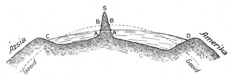A 34. rajz vázlatosan állítja elénk a földkéregnek az északi szélesség 30°-ú párhuzamos körén átmenő metszetét. A pontozott vonal mutatja a geoid-szelvényt; ez kör, mert a földi ellipszoid forgás felszín, melynek egyenlítőjével párvonalas metszetei körök