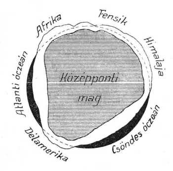 és csak délkörei ellipszisek. E vonal fölé emelkednek a szárazföldek: Afrika, Ázsia és Amerika. Alatta van a két nagy óczeán, melyeknek átlagos mélységei a szárazföldek kiemelkedéseivel hasonlíthatók össze. Ezek alatt a megszilárdult földkéreg nagyobb vastagsága kiegyenlíti a tengerek csekélyebb fajsúlyát, míg a szárazföldeken az aránylag vékonyabb réteg kiegyenlíti a fölemelt földségek magasságát.