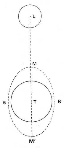 ) (4) Ha d kisebb, mint D, ez az erő a Hold felé irányul; ha nagyobb, akkor az ellenkező értelemben. Ez az erő zérus értékű a B és B' pontokban, mert ekkor d = D.
