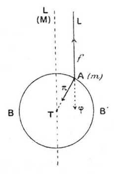 *) Sokkal pontosabban is számot adhatunk a bolygónkra ható eme vonzásról. Gondoljunk egy mozdulatlan, egyközepű vízréteggel borított földgömböt (l. az 53. rajzot). Valamely A vízrészecskére 3 erő hat: 1. saját súlya a Föld középpontjának vonzása következtében; 2. a Hold f vonzása AL' irányban, mely TL-lel párvonalas; 3. az Aφ erő, mely e vonzással ellentétes. Ezt az utóbbi erőt azért kell fölvennünk, mert a Hold a Földet úgy vonzván, mintha tömege a T pontban volna összepontosítva, az egész Földet a maga irányában mozgatja. Minthogy minket csak az érdekel, hogy az A részecske helyzete mennyire változik a Föld középpontjához képest, e mozgást egy ellentétesen alkalmazott, ugyanakkora erővel meg kell szüntetnünk.