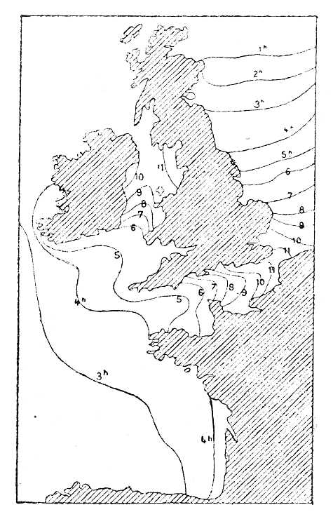 132. 32. A dagály magassága az egyes észlelőhelyeken. Az egyidejű dagály térképeit minden tengerpartra nézve megszerkesztették és éppen olyan forma fölvilágosítást adnak a jelenségről, mint az izobáros térképek az időjárás előrejelzéséről. Oly helyeken, a hol az egyidejű dagályvonalak összesűrűsödnek, biztosak lehetünk, hogy a dagály magasabbra emelkedik, mint oly helyeken, a hol a görbék távolabb esnek és kevésbé hajlottak.