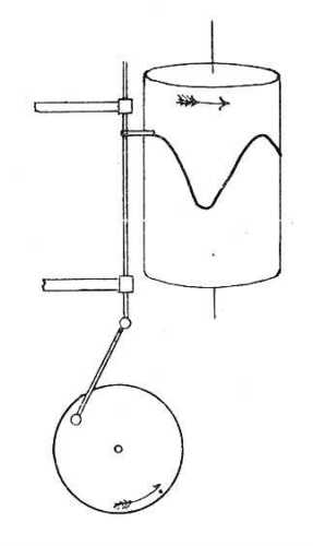 Hullámgörbét igen egyszerű műszer segítségével is meghúzhatunk; a köszörűs hajtórúdjának ismert mozgása ez. Ha kereket forgatunk, akkor vonórúd segítségével e folytonos forgó mozgást váltakozó, egyenes mozgássá változtathatjuk. Ha irószerszámot erősítünk ez egyenes rúdra s előtte egyenletesen papírlapot mozgatunk, a kapott görbe hullámvonal lesz. Az 58. rajzon látható készülék megadja ez elrendezés elvét. Tartalmaz egy vezetékes exczentert, mely folytonos forgó mozgását váltakozó egyenes mozgássá változtatja. Ha e váltakozó mozgást irókészülékre visszük át és elébe mozgó papírlapot teszünk, az így nyert kanyargós vonal az egyszerű hullámvonal.
