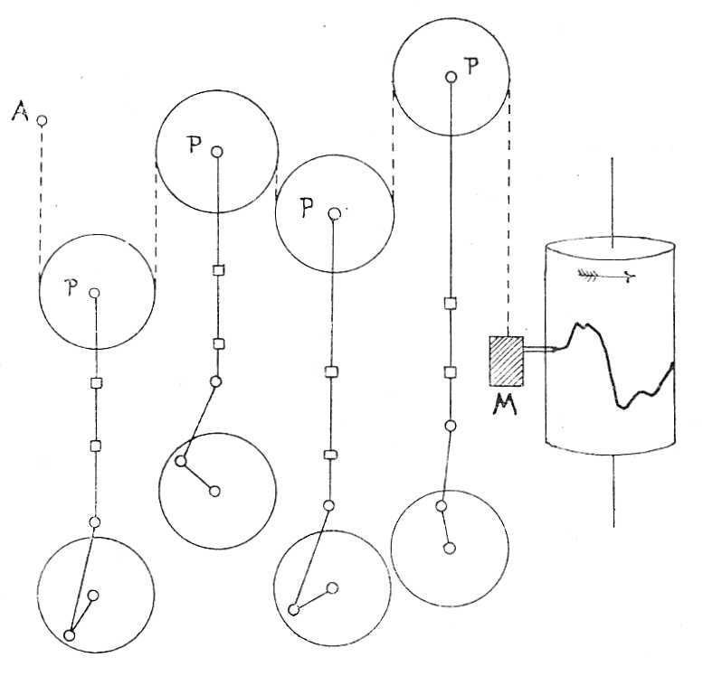 KELVIN lord azt gondolta hát, hogy annyi kerekes vonórudat kell venni, a hány hullámzó mozgást akarunk összetenni. A gondolat megvalósításának vázlatos elrendezése az 59. rajzon látható.