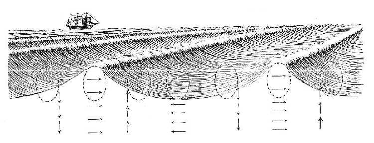 A 61. rajz megmutatja, hogy az óczeáni hullámzás a valóságban miként keletkezik. Látható, hogy a völgyekben a vízrészecskék mozgása ellentétes a hullám haladásirányával, míg egyező irányú a hullámhegyekben.