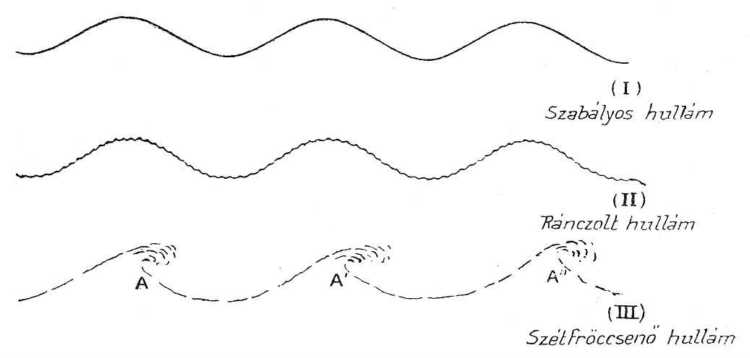 v2 Végül ha a szél még tovább fokozódik, egyes vízrészek permeteg módjára elszakadnak a hullám tetejéről, a hullám homloka felegyenesedik, sőt homorú lesz és teteje tajtékzik, mi az A,A' és A'' helyeken levő üregekben bezárt levegőtömegtől származik; ezek a tarajos, átbukó hullámok, melyek jellegző tünetei a viharnak.