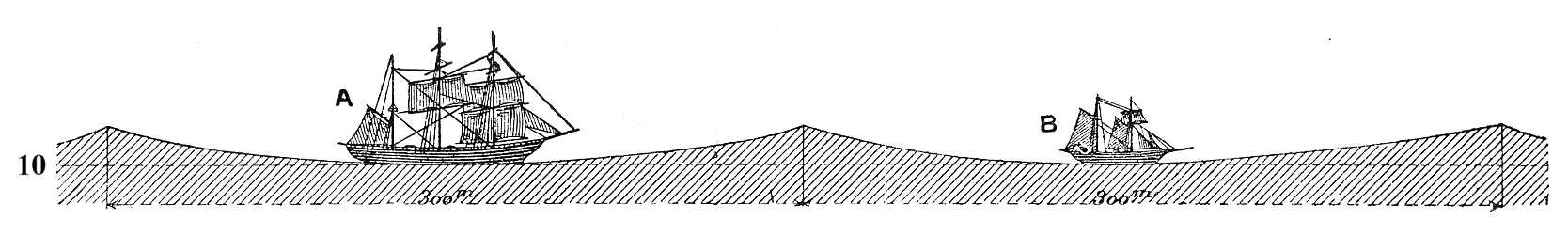 A hullámok magassága. Az észlelt legnagyobb magasság, vagyis a hullám hegy és völgy függőleges irányú távolsága valószínűleg 18 m., ez körülbelül Páris öt emeletes házainak magassága. Ezt a magasságot a déli tengereken észlelték. A 63. rajz 15 m. magas és 300 m. hosszu hullám képét adja egy háromárbóczos hajóval és ugyanoly mértékben rajzolt izlandi kétárbóczossal (goélette).