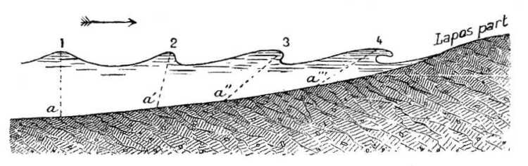 141. A fenék fölemelkedésének hatása. Hullámtörés. Fenékhullámok . Mindig tapasztalható, hogy a lapos partokon még a csekély hullámok is, a legcsöndesebb időben is tarajosak. Ez a tünemény a vízmolekuláknak a fenékhez való surlódásából ered, a mint a feneket egyre jobban megközelítik.