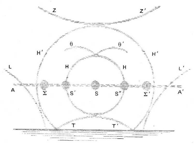 S a Nap, körülötte van a tulajdonképpeni fényudvar, a HH kör; az AA' melléknapi kör nevét viselő vízszintes, fénylő átmérő két végén van az S' és S'' melléknap, mely két nagy színes, belül piros, fénylő folt.