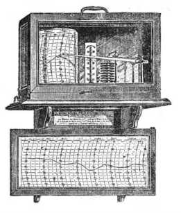 A rajzon a tulajdonképpeni műszer alatt hosszúkás keret látható; ez a keret magába foglalja azt a papíroslapot, a melyre az előző hét légnyomás-változásai vannak föl írva.