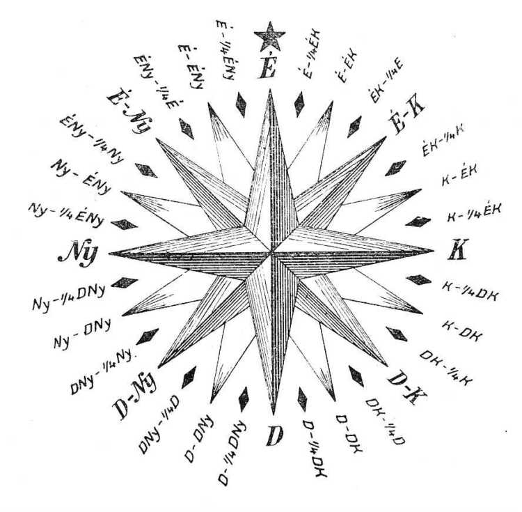 ÉNy 1/4Ny = Északnyugat 1/4 NyugatDK = Délkelet