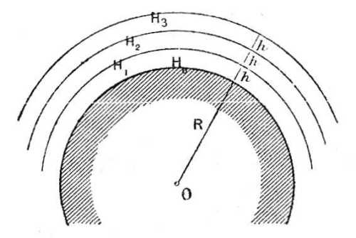 a C1 görbén belül; a H3 felszín éppen így a C3 görbét jelöli ki. Bizonyos, mondjuk H4 izobárfelszíntől kezdve a felszín alakváltozása már nem olyan nagy, hogy a Földet érintse; a melegedés-középpont csak éppen arra szorítkozik, hogy a H4 felszínnek az I4 homorúságot adja, mely a következő izobárfelszineken egyre kevésbé erősen jelentkezik abban a mértékben, a mint a légkörben felemelkedünk bizonyos Hn izobárig, a hol ismét a szabályos gömbalakot találjuk meg. Néha egyes meteorológiai könyvekben megvonják a légkör felső rétegeinek izobárfelszineit is és jelzik azt az alakot a melyet a még gömbalakú izobárfelszíntől kiindulva felvesznek. Mi az ily feltevéseken nyugvó szerkesztésekhez nem ragaszkodunk. Elképzelhető, mennyire pontatlanok és némi valószínűséggel csakis az alsó rétegek izobárfelszineit vonhatjuk meg, az egyedülieket, melyeket manapság kielégítően tanulmányoztak.