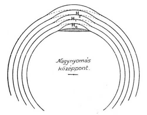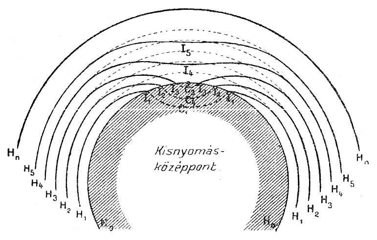A nagynyomások középpontja. Ebben az esetben (l. a 81. rajzot) a tünemény fordított, az izobárfelszinek elgörbülése homorúság helyett domborúságot mutat.