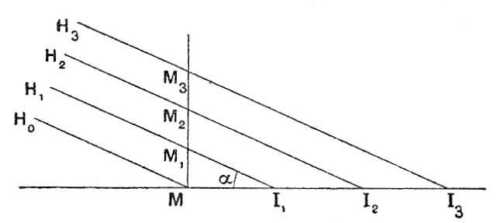 Menjünk a föld felszinén a nyomáscsökkenés irányában, akkor találunk egy I1 pontot, a hol a nyomás H1, majd tovább egy I2 pontot, a hol a nyomás H2 stb. Másrészt tudjuk, hogy a légkörben a nyomás a magassággal csökken; az M pont függőlegesén is vannak oly M1, M2 ... pontok, melyeken a nyomás értéke sorjában H1, H2. E pontok tehát a H1, H2 ... izobárfelszinekhez tartoznak, melyek e szerint az előző pontban mondottaknak megfelelően hajlottak, miként a rajz mutatja.