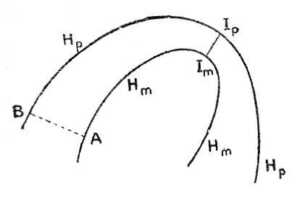 Már most, ha két szomszédos Hm s Hp izobárvonalat gondolunk (l. a 83. rajzot), lesz bizonyos hely, a hol e két görbe merőleges távolsága legkisebb, ez az Im Ip hely; itt fúj tehát a szél a legnagyobb erővel.