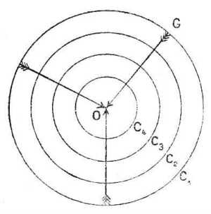 Ily körülmények közt, ha a Föld nem forogna, a grádiens mindig a körvonalak sugara irányába esnék és a szél, miként a 85. rajz nyilai mutatják, kívülről befelé fújna; ez egyenesirányú, középpont felé tartó mozgás volna.