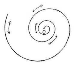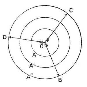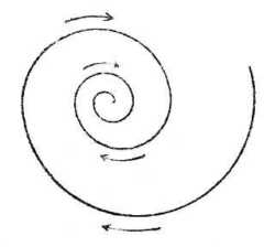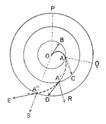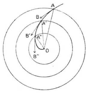 Ugyanebből az okból az A'' részecske A''B'' irányban indul el ... és így tovább. Ennek következtében az A részecske útja a helyett, hogy az AO sugár volna, csigavonal alakú AA'A''O görbe lesz. Más szóval, az északi féltekén a kisnyomású középpontok (minimum) körül a levegő a középpont felé az óramutaló járásával ellenkező irányú örvénybe folyik. A 87. rajz e mozgást ábrázolja; a csavarvonal a kerületből kiindulva, az óramutatóval ellenkező irányban forog és a középpont felé tart.