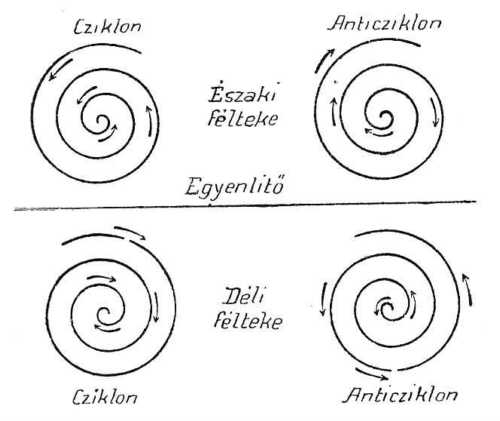 Ily körülmények közt a levegő útja csigavonalú görbe, a mely a középpontból kiindulva az óramutató járása irányában mozog; ez az anticziklónos mozgás, melynek törvénye így hangzik: