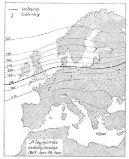 Midőn a dolog így történik, az izobárgörbék jellegző szabályosságot mutatnak, melynek a 101. rajz meglepő példáját adja; itt valóban azt látjuk, hogy az északi Atlanti-óczeán körzésének felső ágát a térképen szabályos, majdnem teljesen párhuzamos vonalak ábrázolják. Középeurópán nagy légnyomású, vagyis szélcsöndes öv terül el, melyet a légi folyó, szabályosan folytatva útját, megkerül. A légáramlatot a térképen az izobárok párhuzamossága jelzi; a párhuzamosság kisebb-nagyobb mértéke egyszersmind magának a szélnek is kisebb-nagyobb szabályosságát mutatja.