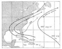 Amerika ama vidékein, a melyek az Antillák "szélességi körén" vannak, két szomszédos körzés csúcsa helyezkedik szembe: az északi Atlanti-óczeáné és az északi Csöndes-óczeárié (l. a IX. térképlapot). Az Atlanti-óczeáni körzés felszálló ága nincsen hát messze a Csöndes-óczeáni körzés leszálló ágától. Ne feledjük, hogy e két ág oly levegőáramlatot hoz, a melyben a nyomás kisebb, és kutassuk, vajjon nem érintkezhetnek-e egymással?