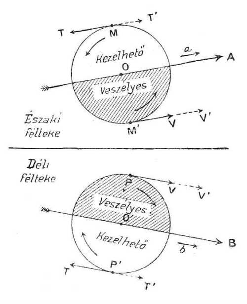 Az északi félgömbön azt a helyet, mely az út jobboldalán van, a hajósok a veszedelmes félnek nevezik, míg a másik részt kezes félnek. A déli félgömbön, miként a 102. rajz mutatja, a veszedelmes félkör az útvonaltól balra, a kezelhető félkör jobbra van.