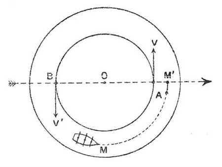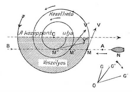 Tegyük fel, hogy az N hajó útja AB irányú (l. a 104. rajzot), oly módon, hogy a veszélyes félkört szeli át; először M-be érkezik, a hol az MV szelet találja, majd M'-be, a hol a szél erősebb és iránya M'V, majd később, midőn M''-be ér, M''V'' lesz a szél.