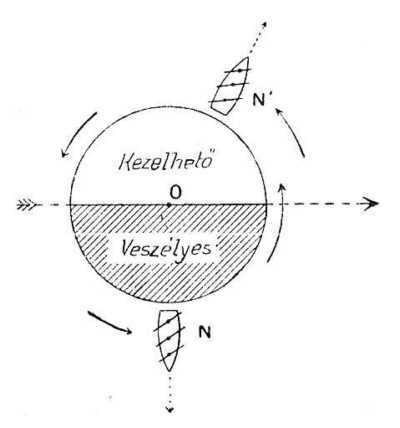 Ha tehát a hajós az északi féltekén a szeleknek az óramutatóval egyező fordulását látja, akkor a veszedelmes félkörön van; ha a forgás ellenkező, akkor a kezes félkörön.