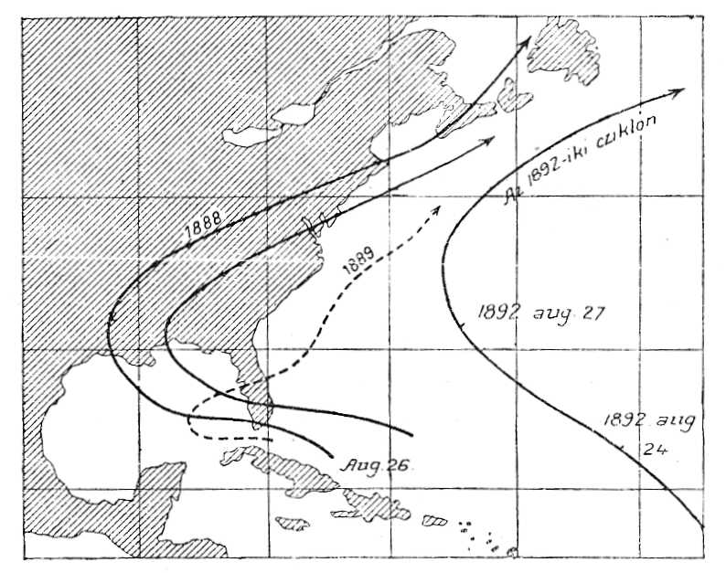 A 108. rajz mutatja a cziklónok eloszlását az óczeánokon és főbb útjaikat. A 109. rajz nehány augusztus havi cziklón útját láttatja az Antillák vidékén.
