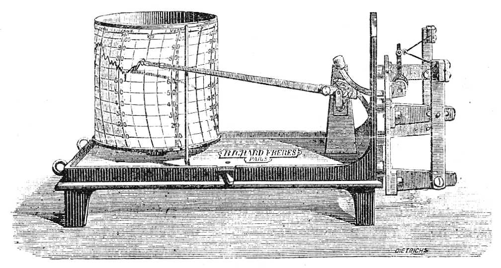 minő a regisztráló barométeré, s oldalán tű ír, a melynek mozgását V alakban kifeszített hajszál megnyúlása, vagy megrövidülése idézi elő (l. a 117. rajzot). A levegő nedvessége nem arányos a hajszál megnyúlásával; az ebből származó hibák elkerülése végett a mozgást a tűre két, egymáson gördülő lemez viszi át, melyeknek görbületét a természettudósok megfigyelései szerint számították és igazították. E két lemez az ábra jobb oldalán látható.