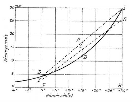 3. Két levegőtömeg keveredése következtében előálló lecsapódás. Láttuk, hogy a páranyomás a hőmérséklettel növekedik, de ez a növekedés nem arányos a hőmérséklettel, hanem gyorsabb. A 119. rajz mutatja annak a görbének az alakját, a mely a maximális feszültséget adja mindenféle hőmérsékletkor REGNAULT kísérletei alapján.
