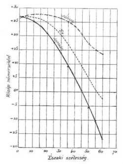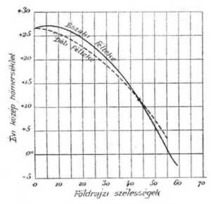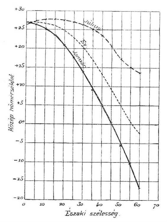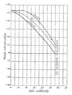 tettük, hogy minden párhuzamos kör átlagos hőmérsékletét raktuk fel; e görbék figyelmeztetnek bennünket az északi félgömb hőmérsékleti kiváltságaira.