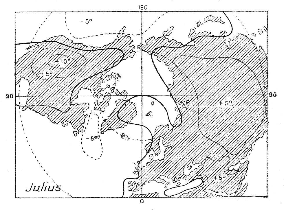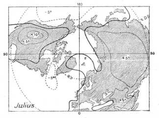 A júliusi térképen (XIV. lap) szintén érdekes jelenségeket találunk. Ekkor van délen tél; a zérus-izoterma felmegy a Horn-fokig s látjuk egyszersmind, hogy a déli tengerek izotermáinak majdnem mértani szabályossága van.