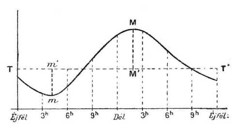 Hőmérséklet. Éghajlat.300. A meteorológiai hatások eredője. Tanulmányoztuk legalább is nagy vonásokban a főbb meteorológiai hatásokat, melyek a légköri jelenségeket alkotják, nevezetesen a légköri nyomást, a szelet, esőt, viharokat stb. Van még egy utolsó elem, a mely az élet feltételei szempontjából a többi közt a legnevezetesebb és a mely az összes többi elem hatásától függ; ez a hőmérséklet. És ez elemnek, valamint a többi már tanulmányozott elemnek egyesült hatása adja valamely vidék éghajlatát.