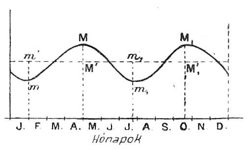a görbének elütő alakja van; az év folyamán két maximumot és két minimumot látunk (l. 128. rajz). Ez az eredmény megegyezik azzal, a mit a napsugárzás-mérés adott az egyenlítőre jutó melegmennyiség változására nézve az év folyamán; a Nap sugarai éjnapegyenlőségkor a Földnek az egyenlítőn fekvő pontjaira merőlegesek lévén, a hőmérsékletnek két M és M1
