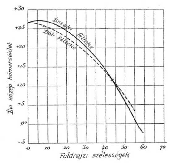 A 131. rajz, melyen a két félgömb minden szélességi fokára meghúztuk az évi középhőmérsékletek görbéjét, tisztán megmutatja a megfordulást a 45 szélességi foknál; a két görbe e szélességi foknak megfelelő pontján metszi egymást. Ha tehát minden földrajzi délkörön azt a pontot választjuk ki, a melyen az átlagos hőmérséklet a legnagyobb és az így nyert pontokat összekötjük, akkor megkapjuk a hőmérsékleti egyenlítő szabálytalan vonalát, mely a földrajzi egyenlítőtől állandóan északra helyezkedik el. Ez okból az egyenlítői szélcsend öve és a passzátok elválasztó vonala az egyenlítőtől mindig északra fekszik.