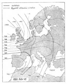 318. Időjárási tipusok. Ha a napi meteorológiai térképeket egymással összehasonlítjuk, sohasem találunk két, egymással megegyezőt; de több olyat találunk, melyek az izobárok csoportosulásának határozott tipusához közelednek.