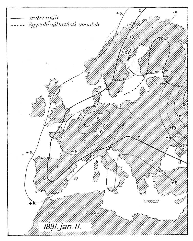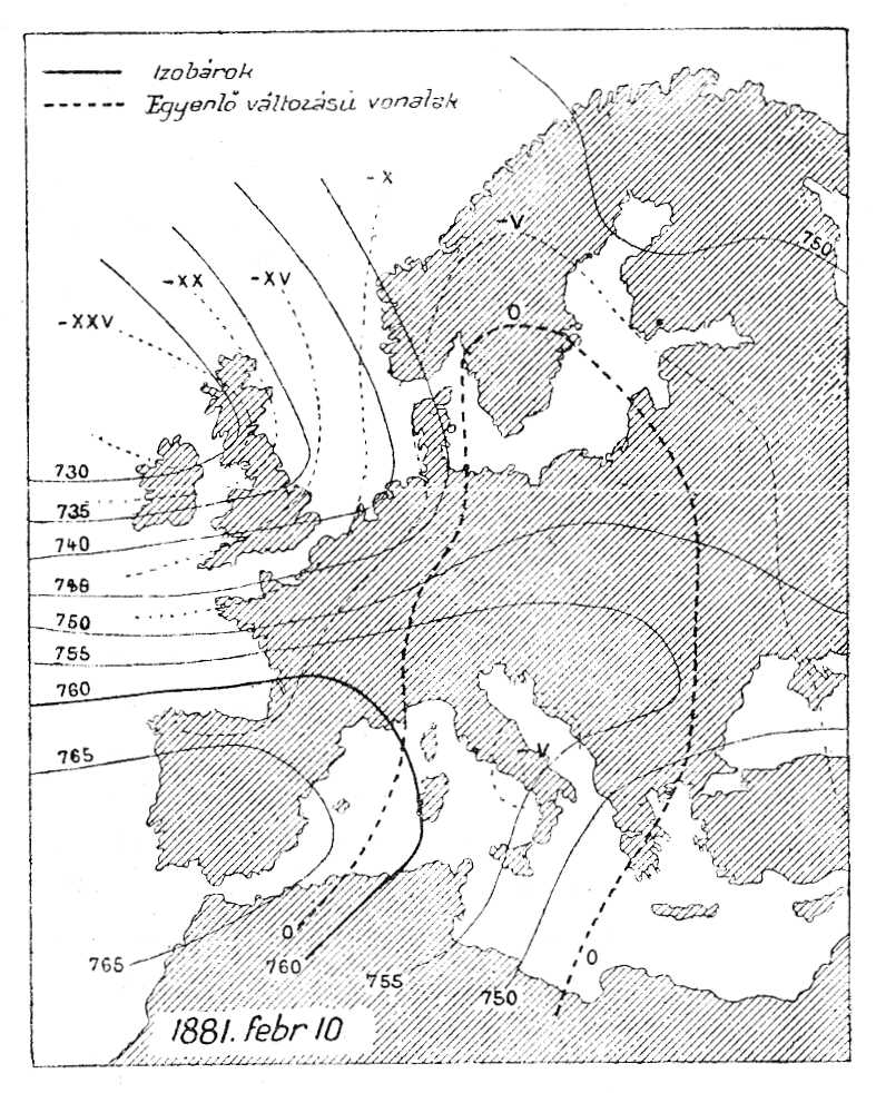 Az izobárokon és izotermákon kívül római számmal jelölt más vonalak is vannak rajtuk; ezek a vonalak azokat a helyeket kötik össze, a melyeken a nyomás ugyanolyan értékkel változott egy nap alatt, például 15 milliméterrel. Ezek az egyenlő változású barometeres vonalak. Éppen így a hőmérsékleti térképen is látunk egyenlő változású hőmérsékleti vonalakat. E görbéket izanomálok-nak is nevezik. Fontosságuk rendkívül nagy, mikor valamely vihar megérkezését kell előrejelezni, miként mindjárt kimutatjuk.