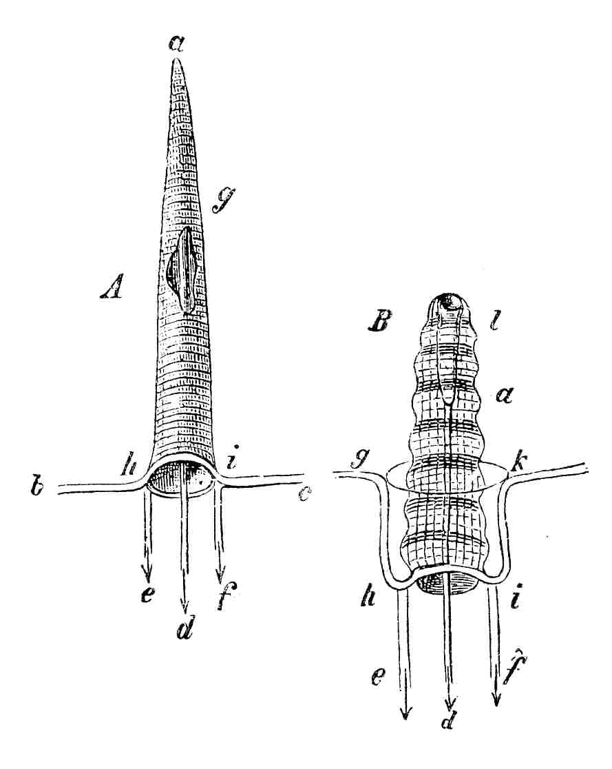 ugyanilyen betürődés több más kiálló ágy [lágy?] testrészen, nevezetesen bizonyos tapogató-féle műszereken, valamint különféle állat ormányán is észlelhető. Az említett szerveken, azonban a betürődésnek még egy harmadik módja, azaz a tapogató hegyéből kiinduló betürődés is szerepel. Képzeljük, hogy A tömlő tengelyében egy izom (d) van kifeszítve, mely annak a végén tapad; már most könnyen érthető, hogy ezen izom összehúzódására a tömlő vége oly módon türődik be, a mint a B ábra vázolja. Ézen, a keztyűujj módjára betürődött tömlő hegyén látható a betürődési nyílás, a-nál pedig a tapogató betürődött vége, melyhez a visszahúzó izom tapad. A betürődés (in vaginatio) ezen módja igen szépen és könnyen megfigyelhető a csiga tapogatóin (szarvain) is. |
