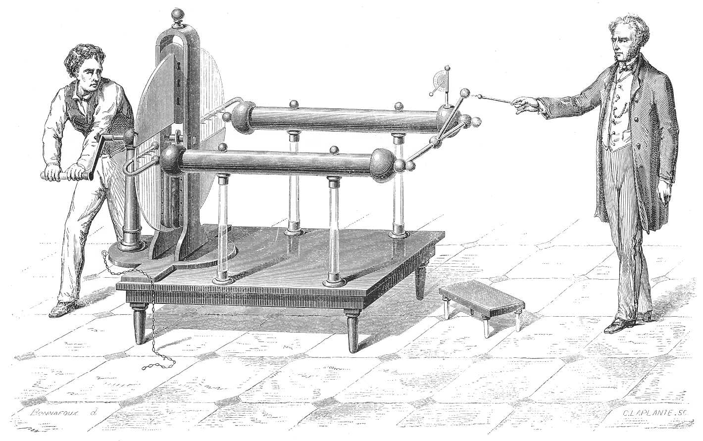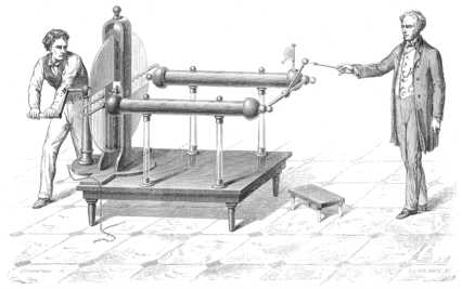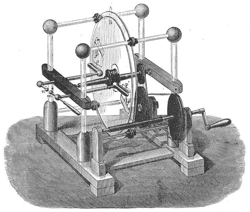 Egy nagy köralakú üvegtábla * fémtengelyre függőlegesen van erősítve, mely körül forgattyú segélyével forgatható. Az üvegkorong két fa oszlop között áthaladva, melyek tengelyét tartják, felületén az oszlopokhoz erősített két vánkospárhoz súrlódik. A forgó mozgás tehát az üvegkorong elektromozását vonja maga után, mely mindkét felületén positiv elektromossággal töltetik meg. A vánkosok nincsenek szigetelve, hogy a rajtuk fejlődő negativ elektromosság a földbe áradhasson; mert ha ez az elektro-