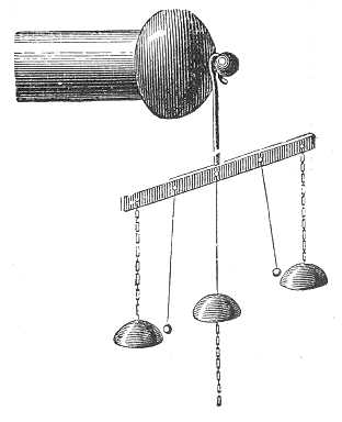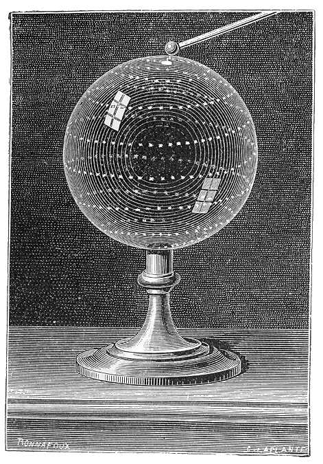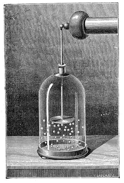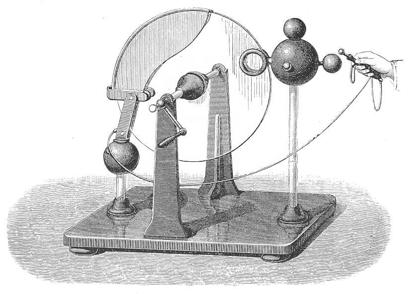 A 125. ábra egy VOLTÁ-tól kigondolt készüléket tüntet elő, melyről ő azt hitte, hogy a készülék előidézte jelenségből a jégesőnek a vihar alatti járását megmagyarázhatja. Ez egy üvegharang, mely az alapjául szolgáló tál közbenjárásával a talajjal van közlekedésben. Egy fémpálczának külső vége az elektromozó gép konduktorával érintkezik, s másik végével a haraug belsejében egy fémtányért tart. A harang alján bizonyos menynyiségű bodzabél golyó hever. A mint a gép működni kezd, az elektromosság a tányérra ömlik, s a golyókat, melyek gerjesztés útján elektromosak